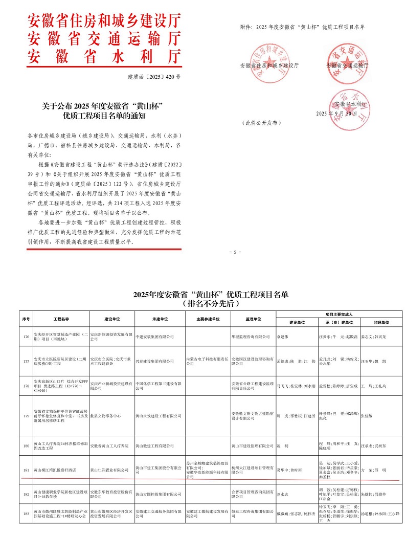 近日,安徽省住房和城鄉(xiāng)建設廳、安徽省交通運輸廳、安徽省水利廳聯(lián)合公布了2025年度省“黃山杯”優(yōu)質(zhì)工程項目名單,黃山市建工集團承建的黃山橫江灣凱悅嘉軒酒店項目成功入選,榮膺安徽省建設工程質(zhì)量最高榮譽——“黃山杯”獎。